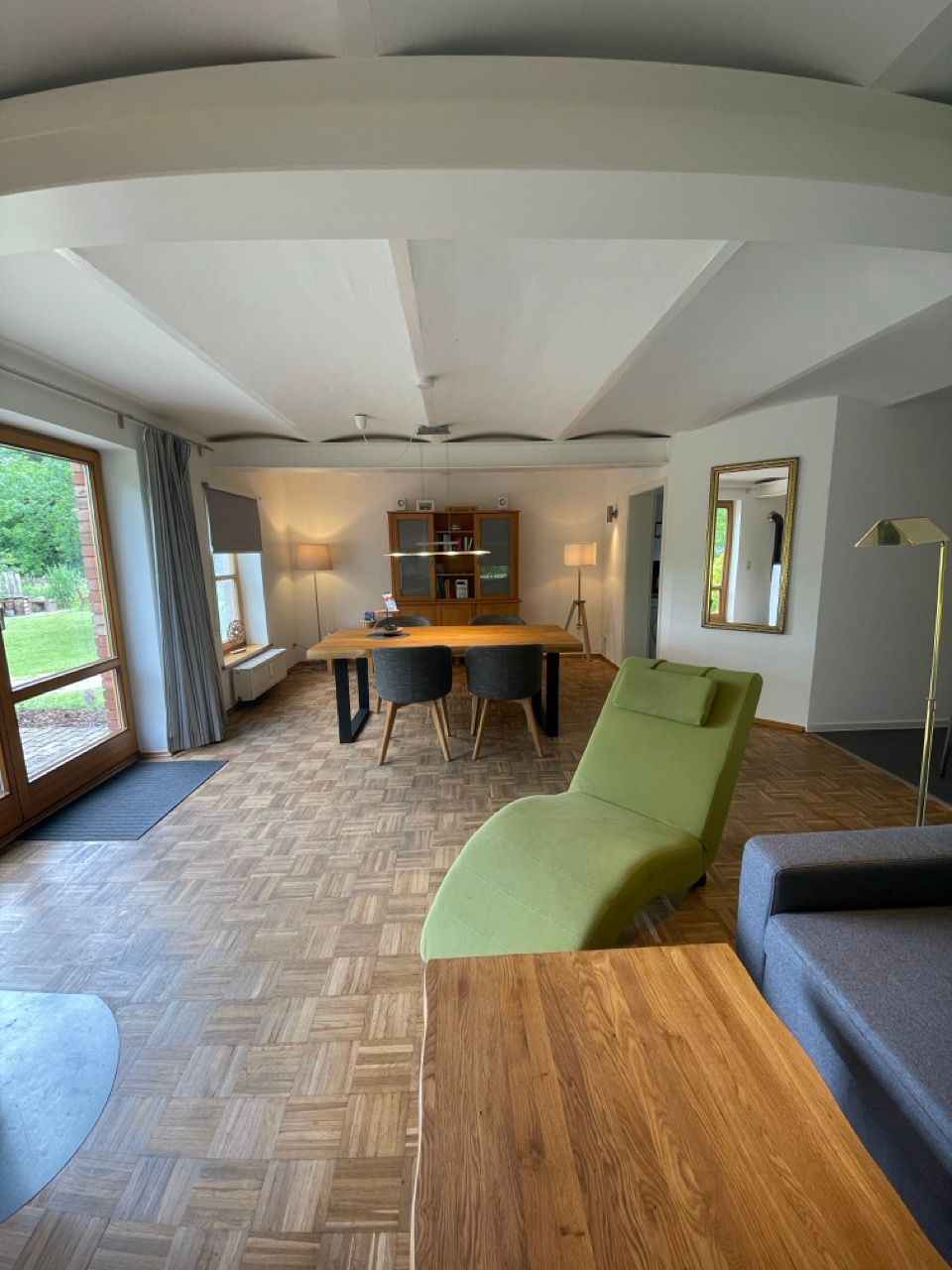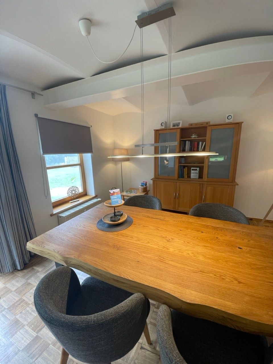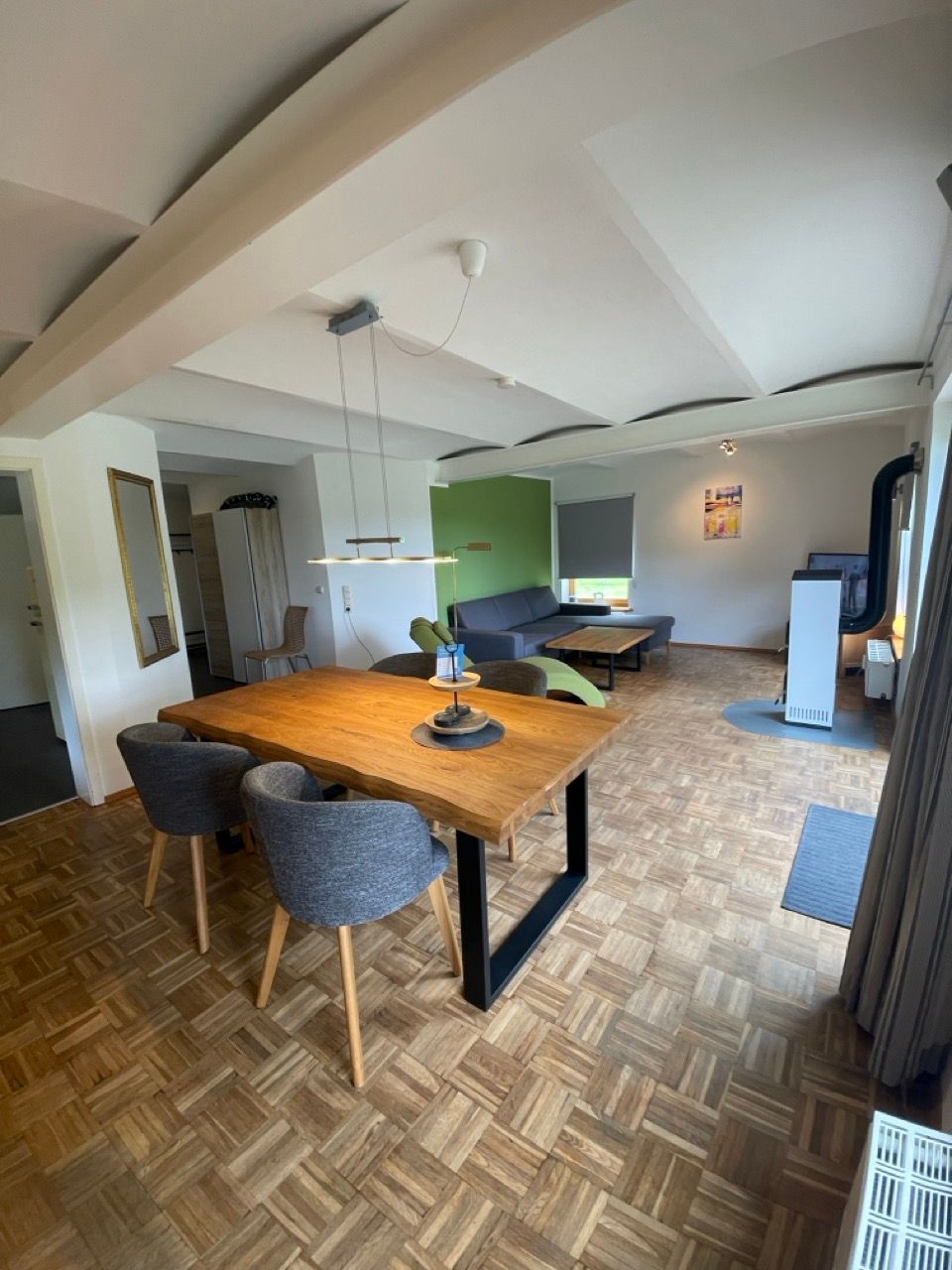 Unsere Unterkunft im Ergeschoss ist hell, modern und gemütlich eingerichtet. Das große Wohnzimmer mit Gewölbedecke hat einen großen Sitzbereich mit TV und einen massiven Holz-Esstisch für vier Personen. Die Küche schließt direkt offen an.
