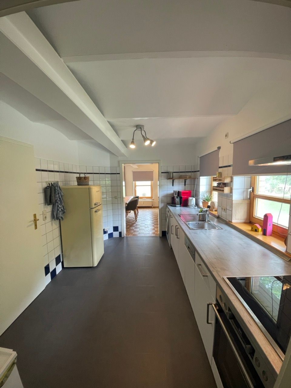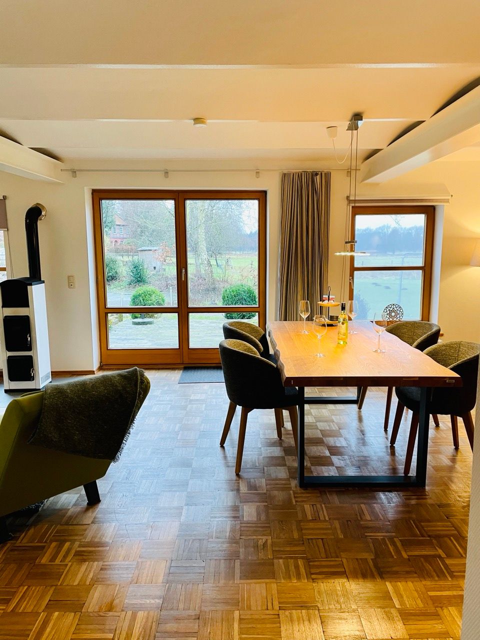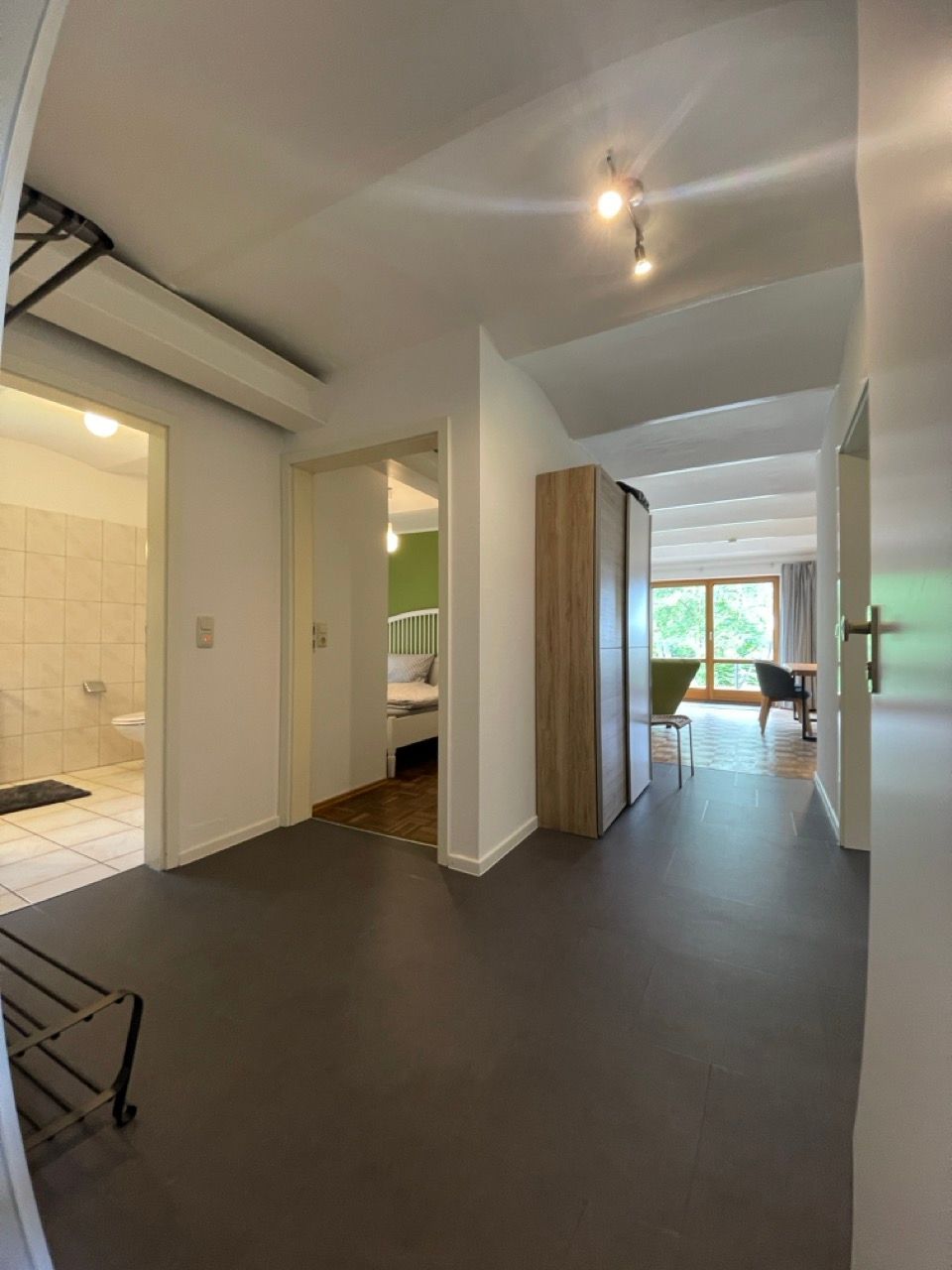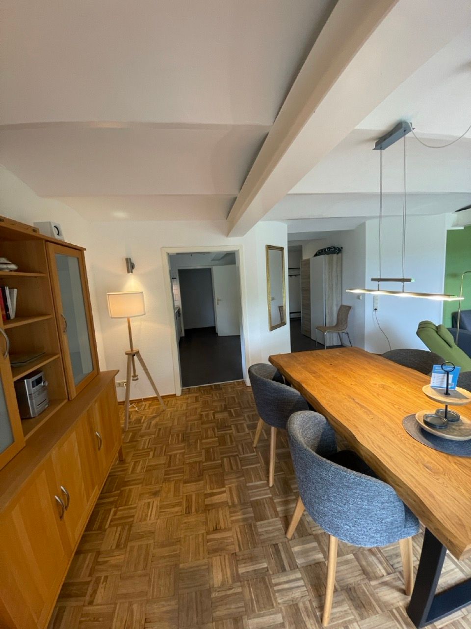 Unsere Unterkunft im Ergeschoss ist hell, modern und gemütlich eingerichtet. Das große Wohnzimmer mit Gewölbedecke hat einen großen Sitzbereich mit TV und einen massiven Holz-Esstisch für vier Personen. Die Küche schließt direkt offen an.